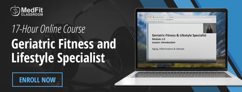 Millions of people over age 65 looking for guidance from fitness professionals who are knowledgeable in exercise, nutrition and lifestyle principles that can help them improve functional mobility, while also preventing and managing chronic conditions to live their highest quality of life. The Geriatric Fitness and Lifestyle Specialist online certificate course will give you insights, strategies and tools to be a successful professional in this rapidly growing market. Learn how to be a valued part of clients’ continuum of care, working with the medical team to improve functional outcomes and positively impact people’s lives.